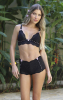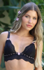 O soutien estilo triângulo é confeccionado em renda floral delicada, com forro de algodão para maior conforto. A base do busto é adornada por um passa-fita artesanal, com fita de cetim entrelaçada — um toque vintage com ar contemporâneo. As alças finas seguem o mesmo estilo, com passa-fita aplicado e regulagem para ajuste perfeito. A base mais larga, também em renda, se estende até as costas, onde encontra uma tira elástica ajustável com fecho tipo click decorado com strass.