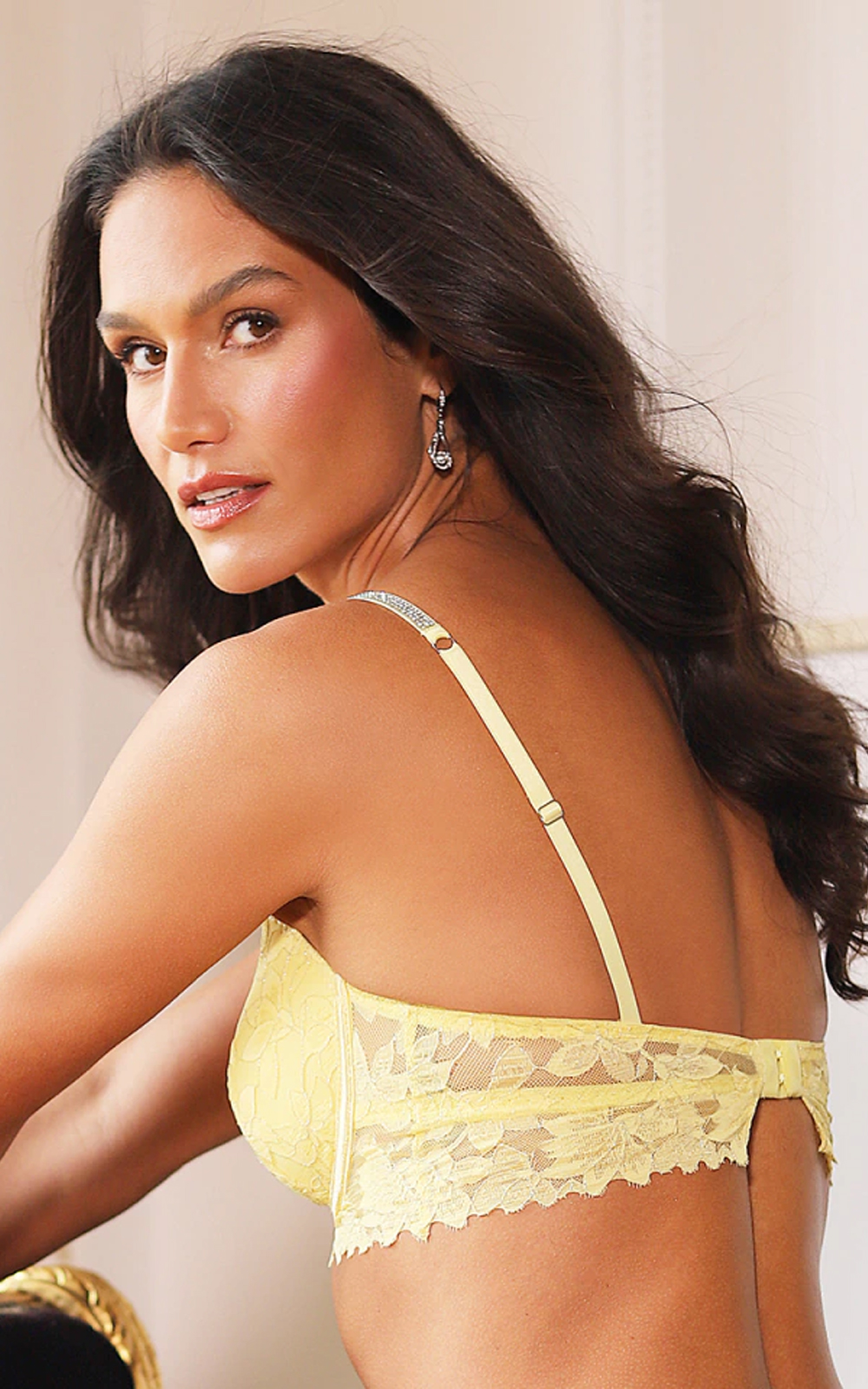 Soutien com bojo em renda floral, realçado por filete metálico e aplique no decote. A base estilo top oferece sustentação moderna, enquanto as alças de strass adicionam brilho e elegância.