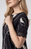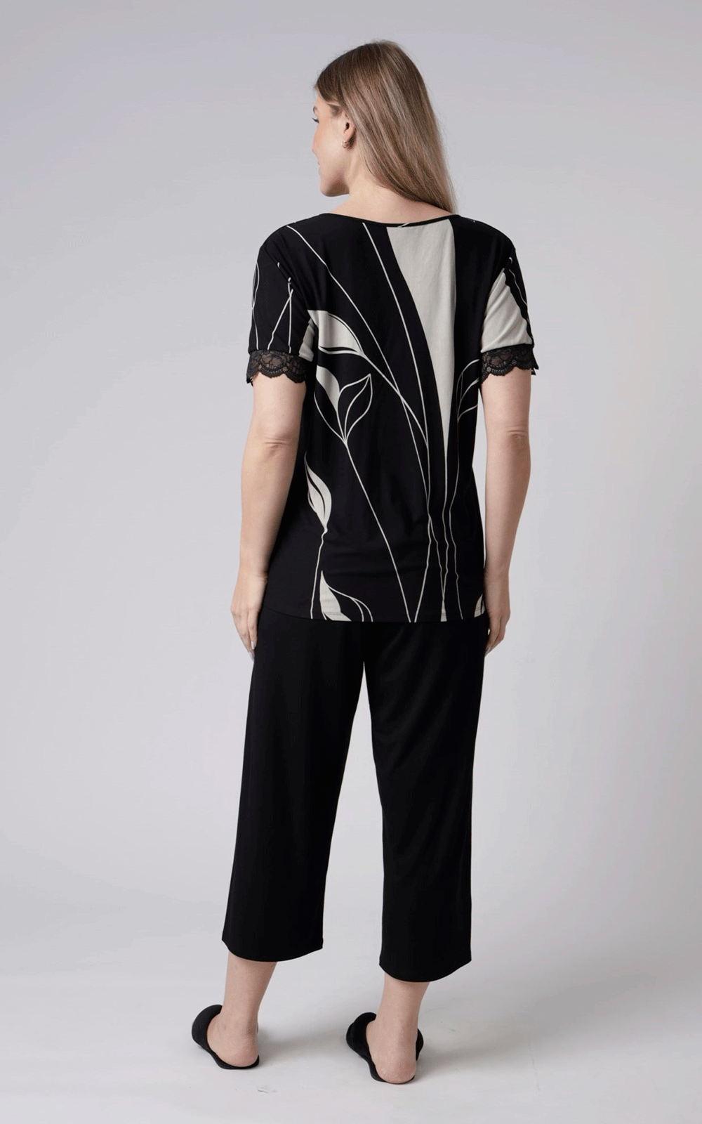 A blusa rongeant flower, tem manga curta, decote arredondado e renda na manga que valoriza o visual com design elegante, enquanto a calça preta capri garante conforto e liberdade de movimento. O tecido em visco premium rongeant completa a proposta com toque suave.