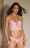 Tanga fio em renda delicada que une ousadia e sofisticação. Na frente, os elásticos cruzados criam um efeito moderno e sofisticado sobre a renda, enquanto os pingentes de cristais nas laterais surgem como pontos de luz preciosos. A renda se estende com leveza até a parte traseira, mantendo seu desenho elegante e valorizando o corpo com transparência sutil, realçada pelo acabamento em microfilamento metálico que acrescenta um toque sedutor.
