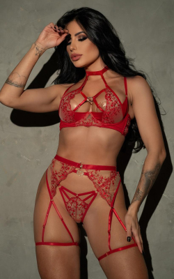 CONJUNTO EM TULE BORDADO, SUTIÃ COM CHOCKER . CALCINHA FIO