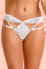Calcinha com o espírito fetichista do harnerss surpreende na combinação de elásticos reguláveis conectados por argolas combinados com recortes inusitados na renda que valorizam as formas e que juntos desenham fendas que são pura sedução.