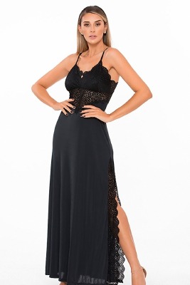 Camisola longa em poliamida com renda. Fendas na lateral