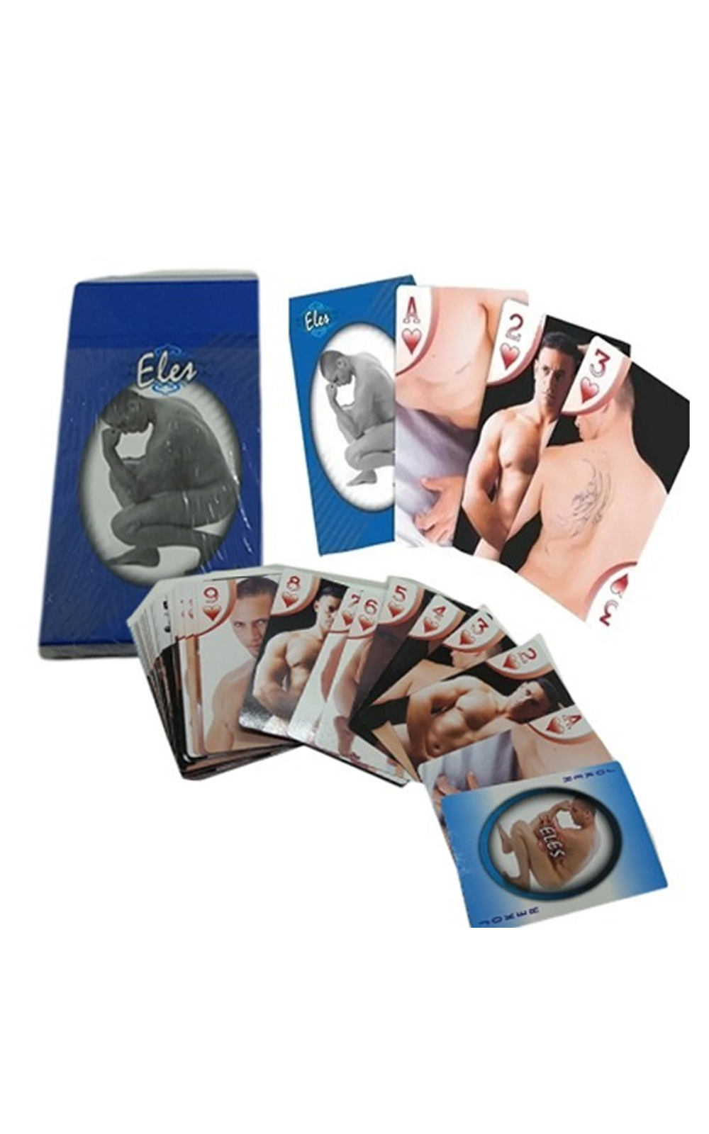 Esse produto da imagem é um Baralho Erótico Masculino – "Eles", voltado para o público que aprecia imagens sensuais de homens nus. Com 54 cartas ilustradas com modelos masculinos em poses sensuais ou explícitas, e costuma ser usado para entretenimento adulto, brincadeiras entre amigas, despedidas de solteira, ou até como item colecionável.