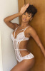 Body com efeito mosaico sobre a pele graças aos elásticos e rendas estrategicamente aplicados para valorizar as formas e, combinados ao tule ilusione em toda frente que estrutura a peça ao corpo num caimento impecável. Pura fascinação.