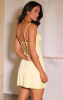 O liganete cria uma base fluida e confortável, enquanto a renda floral, trabalhada com filamentos prateados, ilumina delicadamente os contornos do desenho. O busto foi cuidadosamente modelado para um encaixe perfeito entre tecido e renda, oferecendo sustentação suave e realce elegante. Na parte frontal, a renda aplicada em formato descendente alonga a silhueta, conduzindo o olhar até o centro, onde um pingente de cristal adiciona um toque de luz. A fenda sutil na frente, finalizada com renda, garante sensualidade na medida certa. Nas costas, o decote profundo em efeito trançado combina ousadia e sofisticação, completando o design com impacto refinado.