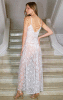 Com um um verdadeiro jogo de transparências e texturas, onde cada detalhe revela o equilíbrio perfeito entre leveza e luxo.Na parte da frente, o bordado se estende do ombro até abaixo da cintura, criando um desenho vertical alongado que valoriza as linhas do corpo. O tule invisível no centro dá a ilusão de pele à mostra, enquanto tiras cruzadas sobrepostas desenham o busto com sutileza.As costas, inteiramente em renda delicada até a cintura, revelam a pele com desenho sofisticado, destacando o contorno natural da silhueta.A saia em Laise transparente apresenta modelagem evasê, fluida e suave, permitindo que o tecido acompanhe o movimento do corpo com sensualidade.