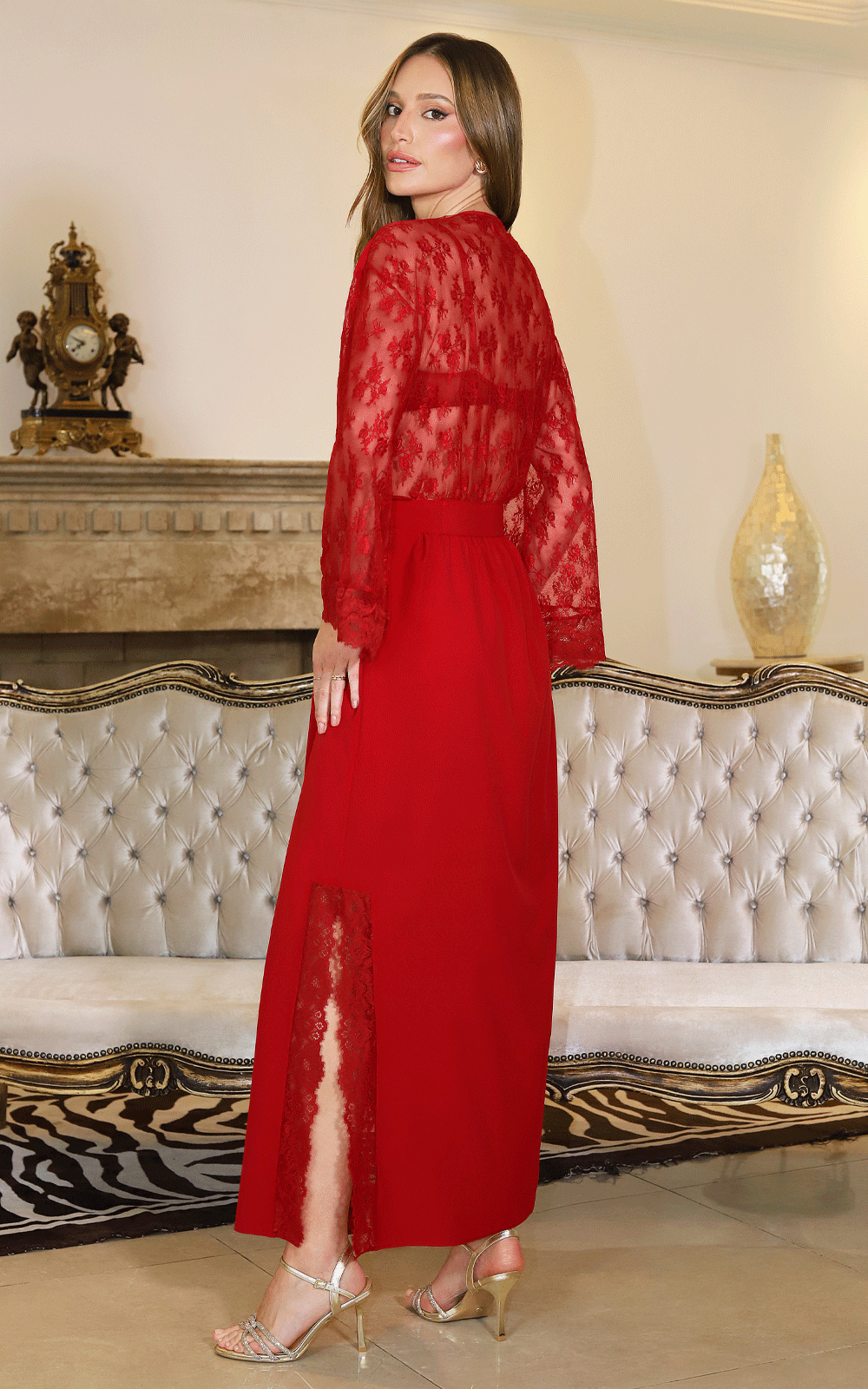 Destaque da coleção, criada para unir luxo, conforto e movimento em um design que valoriza a silhueta feminina com maestria.A frente inteira em hi-multi elastano garante caimento perfeito, enquanto o jogo de materiais cria contrastes estratégicos de textura e transparência, ressaltando as curvas de forma delicada . Aberturas cuidadosamente posicionadas nas laterais adicionam um toque de sensualidade sem perder a sofisticação.As mangas e as costas até a cintura são em Laise transparente e delicada e conferem leveza e movimento à peça. O acabamento na parte da frente, nas mangas e nas fendas laterais são em renda e mantém o design harmonioso e elegante, reforçando a atenção aos detalhes característicos da coleção.