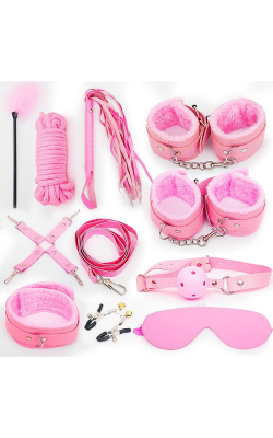 kit sado composto Com forro interno - Produtos, mordaça, venda, coleira com guia, chicote, algema e tornozeleira e
