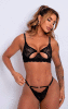 -O sutiã traz recorte ousado abaixo do busto, acabamento em renda e detalhe metálico em formato de coração.