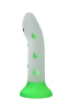 Dildo com ventosa, Luminoso no escuro, confeccionado em silicone, possui um formato para penetrações em ângulo reto