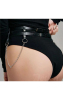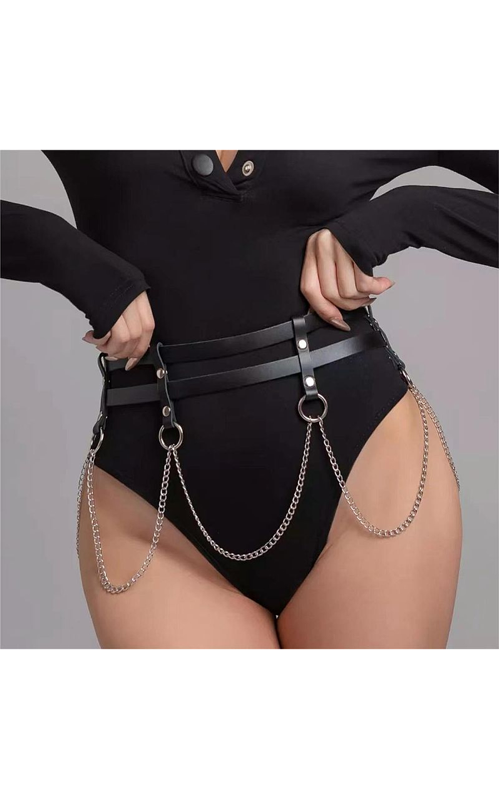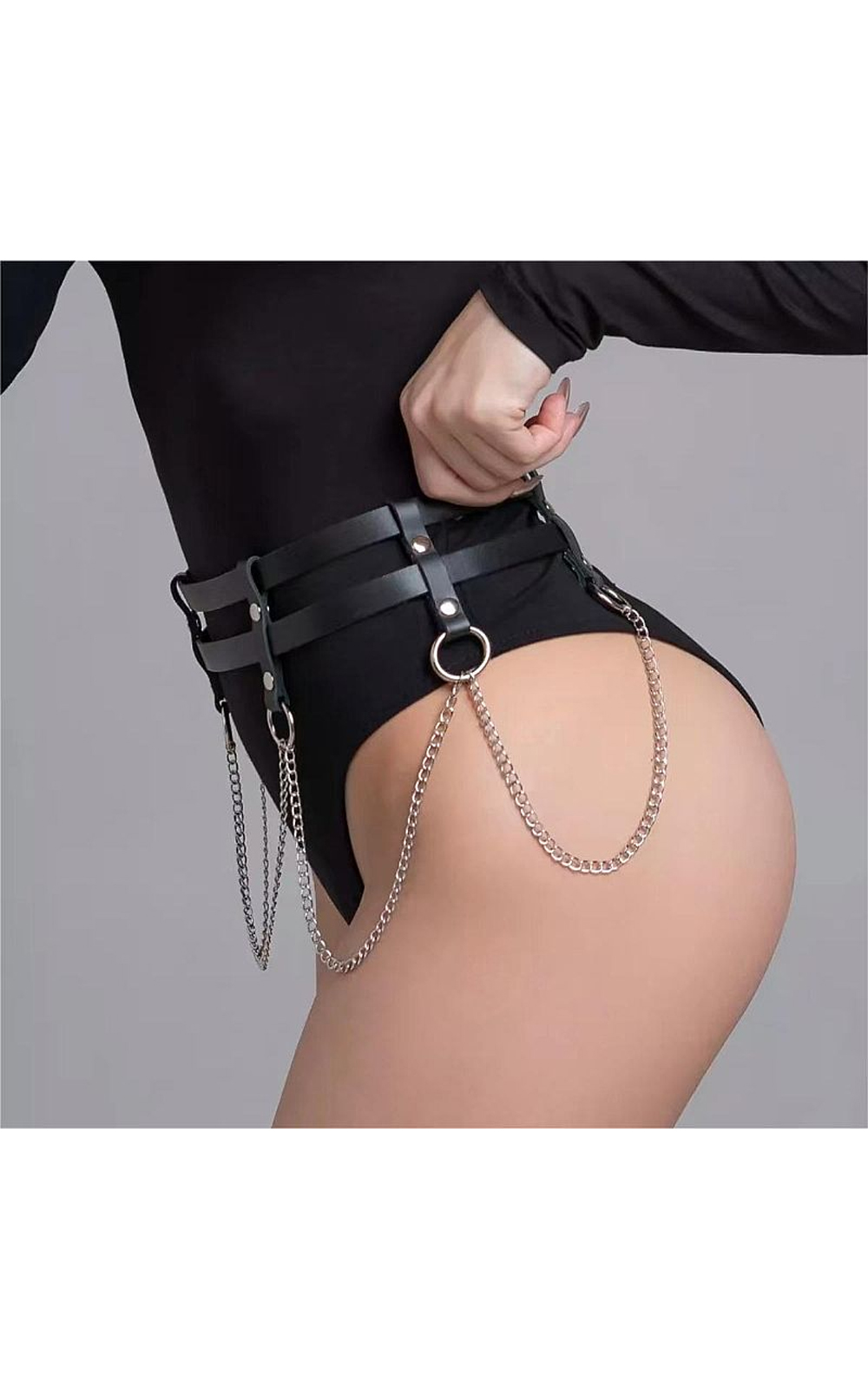 Confeccionado em couro sintético com detalhes em rebite, correntes e fivelas para ajuste que prendem a peça.