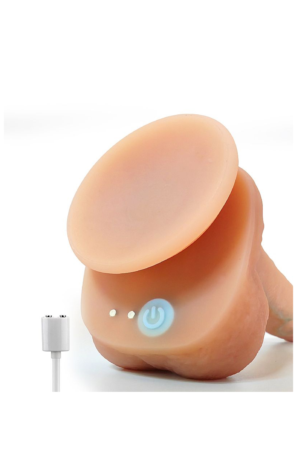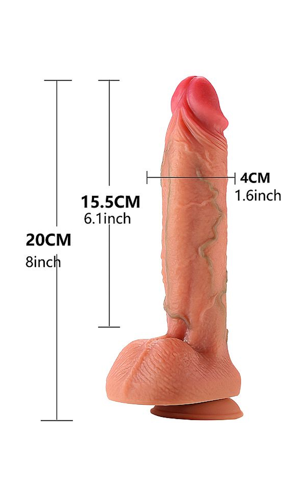 Confeccionado em silicone. Possui glande definida, textura de veias, escroto e ventosa para penetrações em ângulo reto.
