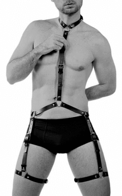 Confeccionado em couro sintético com detalhes em rebite e fivelas para ajuste que prendem a peça.