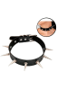Coleira bondage ajustável por meio de fivelas metálicas, confeccionada em couro sintético.