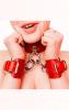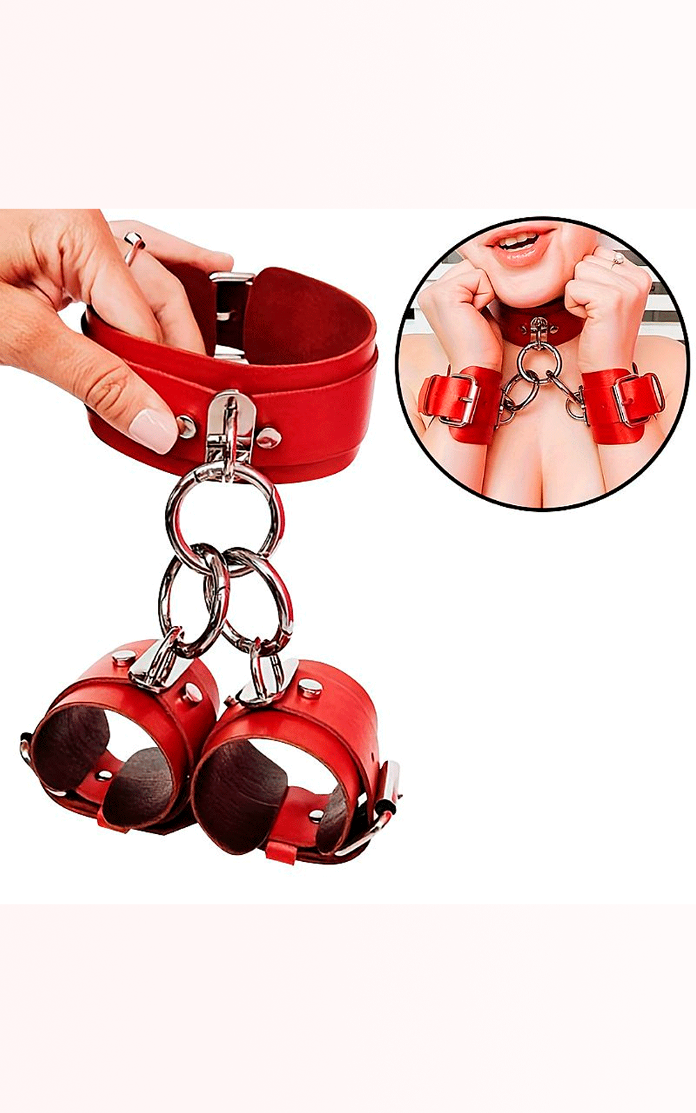 Coleira bondage ajustável por meio de fivelas metálicas, confeccionada em couro sintético.