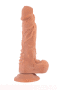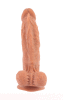 Prótese realística com escroto, veias salientes, glande pequena e ventosa.