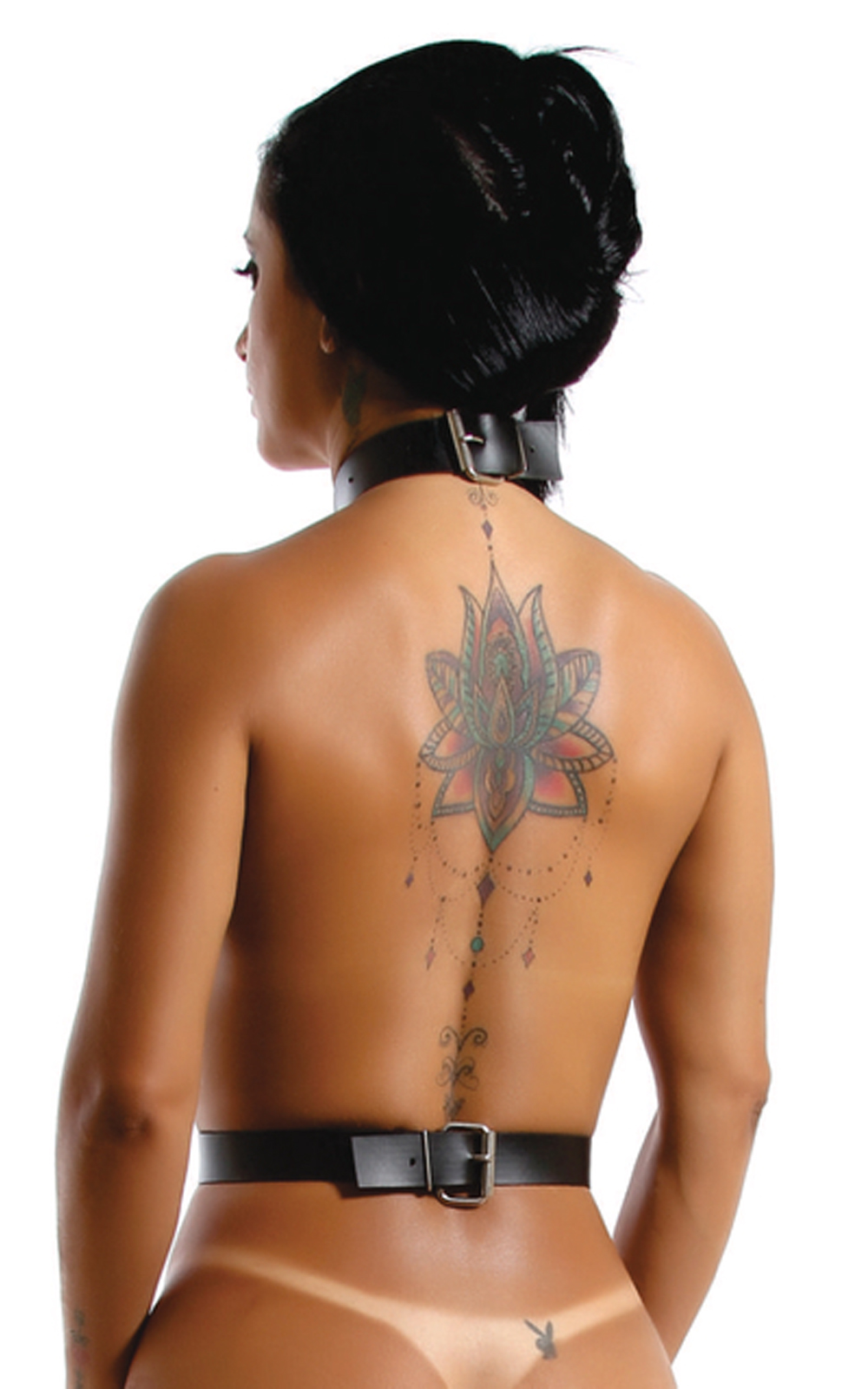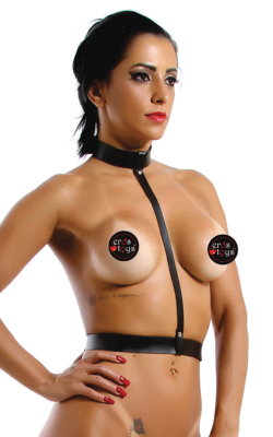 Confeccionada em couro sintético, rebites e acessórios metálicos