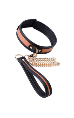 Coleira com guia de corrente e puxador, possui interior forrado e ajuste com fivela.