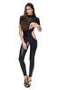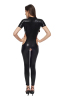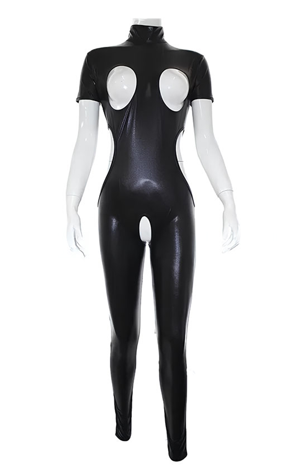 Macação feminino com gola alta, mangas curtas, recorte nos seios, virilha, bumbum e costelas.